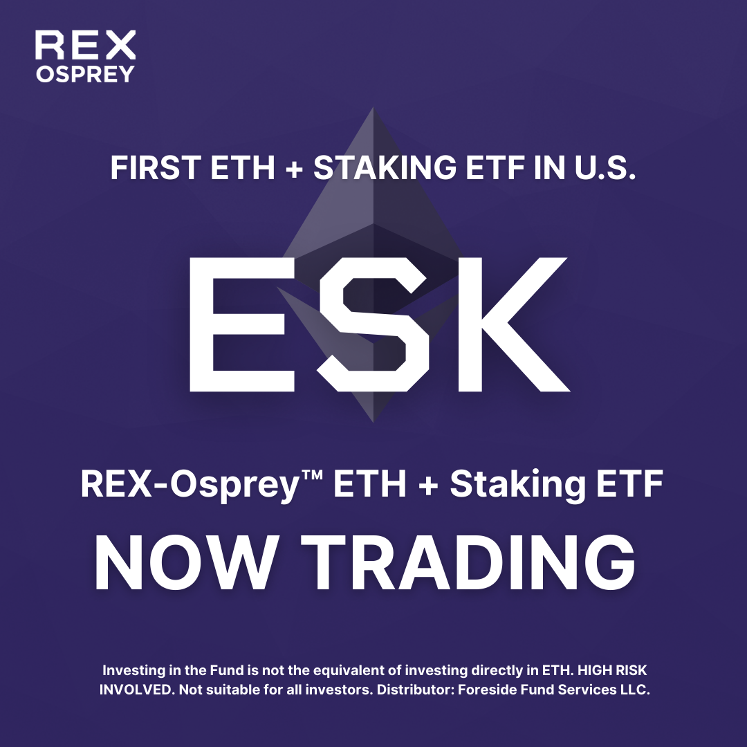 September 29, 2025 – REX-Osprey™, a strategic collaboration between REX and Osprey Funds, is pleased to announce that options are now available for the recently launched REX-Osprey™ Eth + Staking ETF (CBOE: ESK). As the first and only ETF to provide both spot Ethereum (ETH) exposure and Ethereum network staking rewards, this development gives investors expanded tools to access Ethereum exposure with enhanced flexibility and precision.